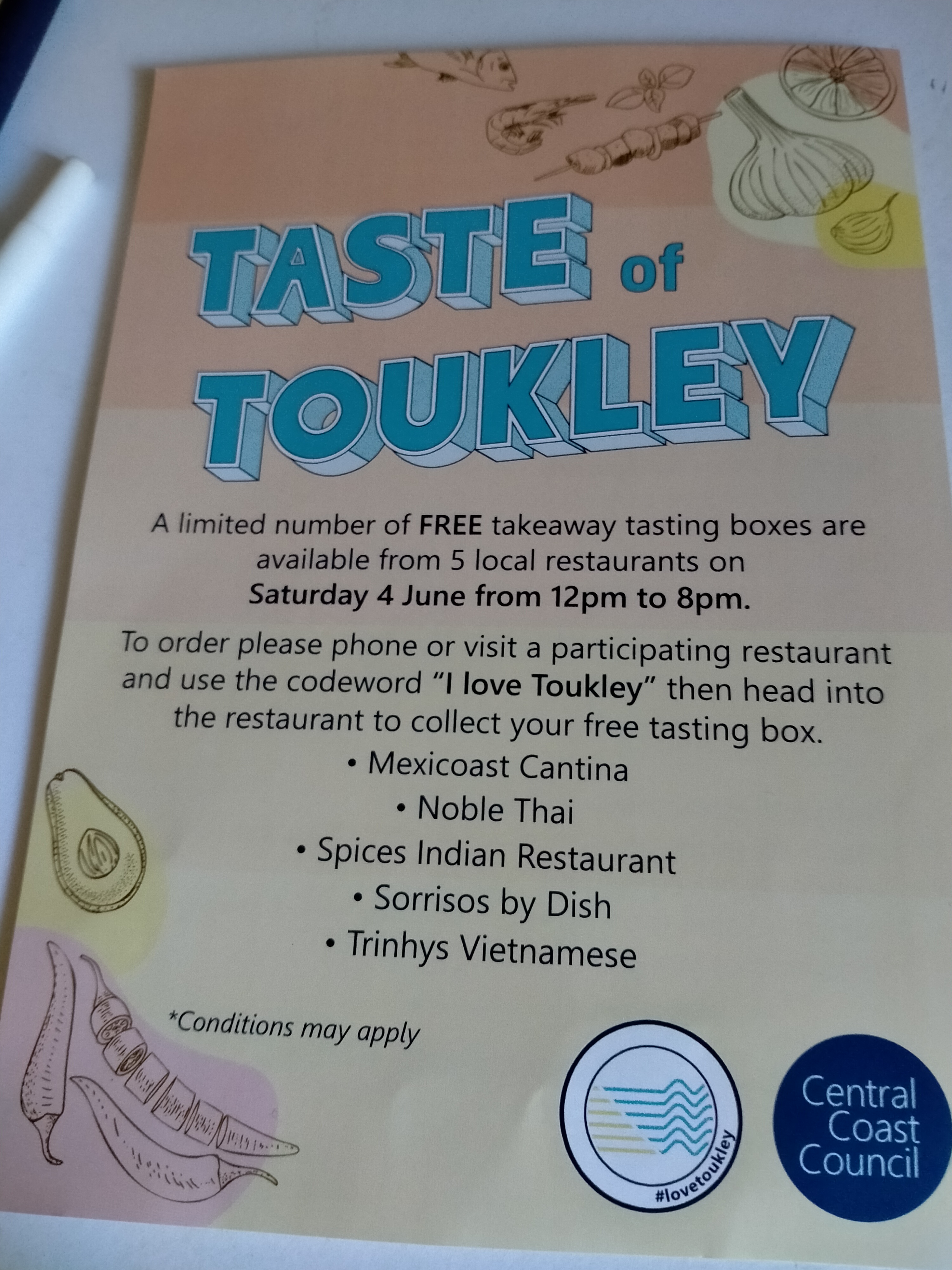“Taste of Toukley is an activation designed to celebrate the best of Toukley by showcasing the diversity of cuisine and business offerings available in Toukley. Five local restaurants will be providing a limited number of FREE takeaway tasting boxes showcasing their menus to the community. The free tasting boxes will be available on Saturday 4 June from 12noon to 8pm (while stocks last) and to order the tasting boxes community members must use the code-words ‘I love Toukley’… From 11am to 2pm on Saturday 4 June the Village Green will host a range of activities designed to encourage the community to attend and enjoy takeaway or dine in options from local eateries.“