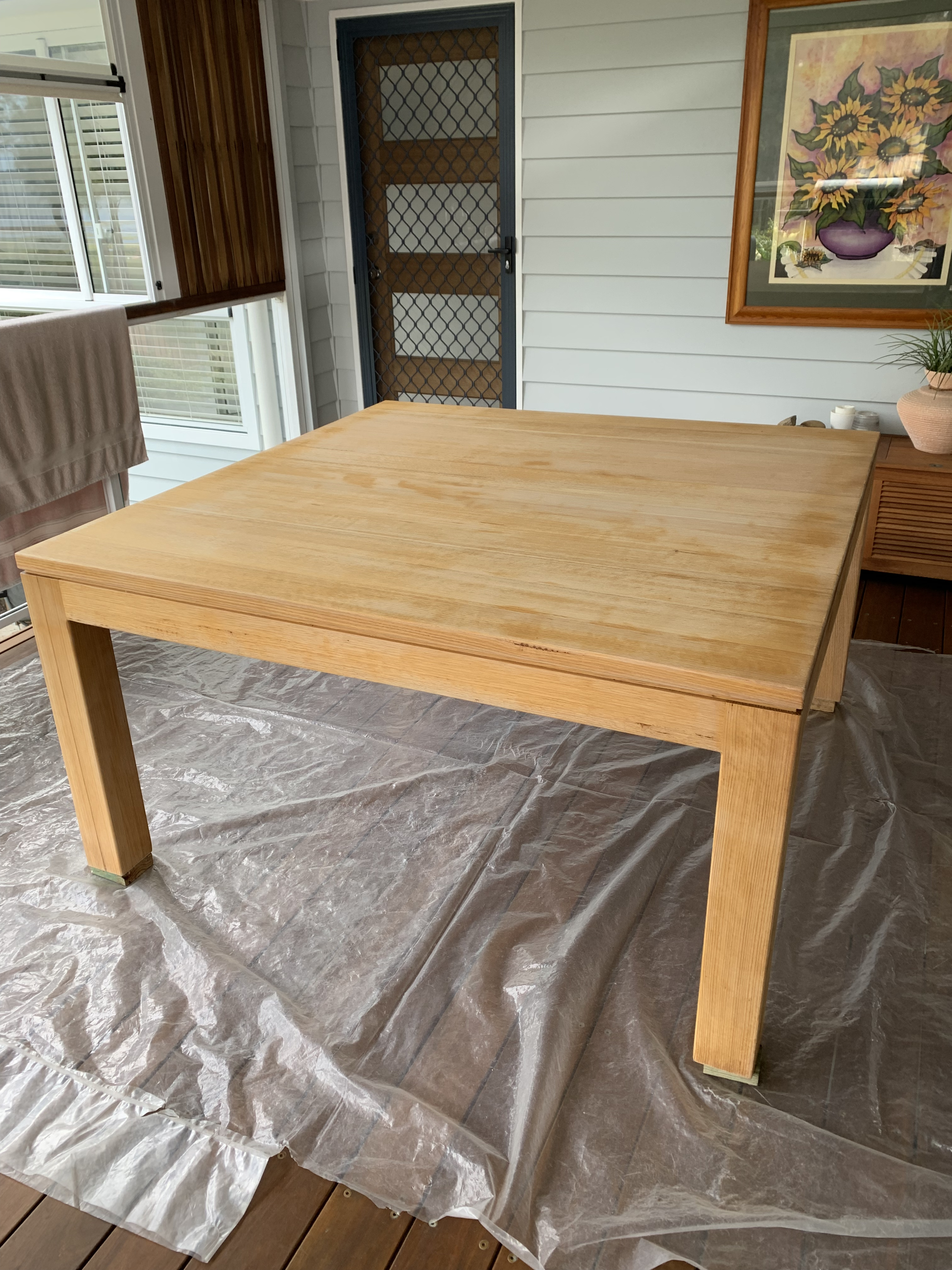 In these images below the tables and benches are being given a color finish or a clear outdoor spray coating.